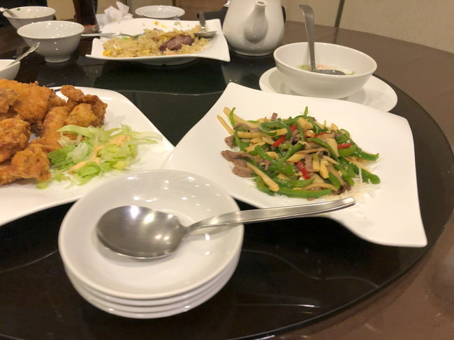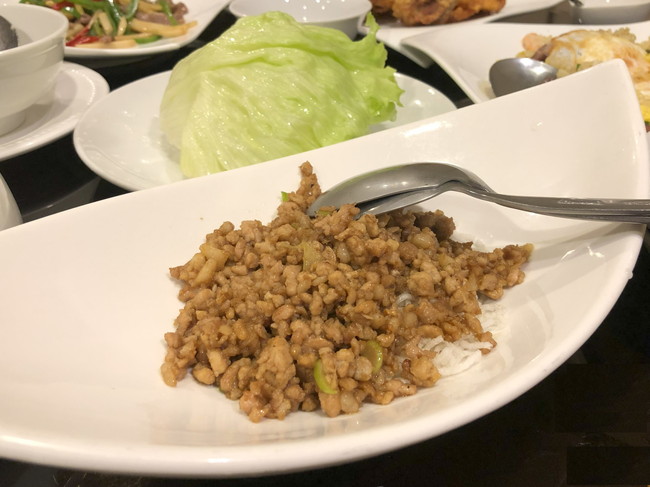 中華の定番、レタス包みです。揚げ春雨がアクセントになっていておいしい。レタスも新鮮でシャキシャキです。お料理がどんどん運ばれてくるのであっという間にテーブルがいっぱいになってしまいました。