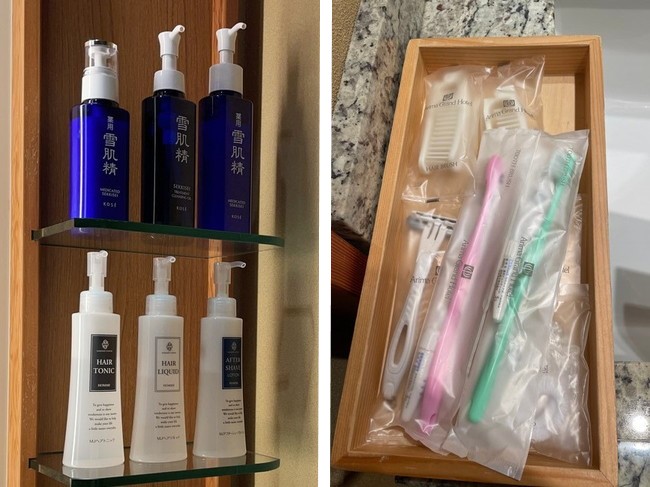 歯ブラシなどの基本的なアメニティはもちろんですが、クレンジングや基礎化粧品、ヘアリキッドやアフターシェーブローションまでそろっていました。ここまで揃っていれば、手ぶらで来ても大丈夫そうです。