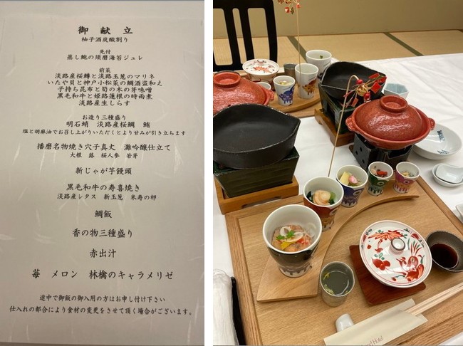 客室とは別に夕食用のお部屋も用意されていました。お品書きのメニューは盛りだくさん。