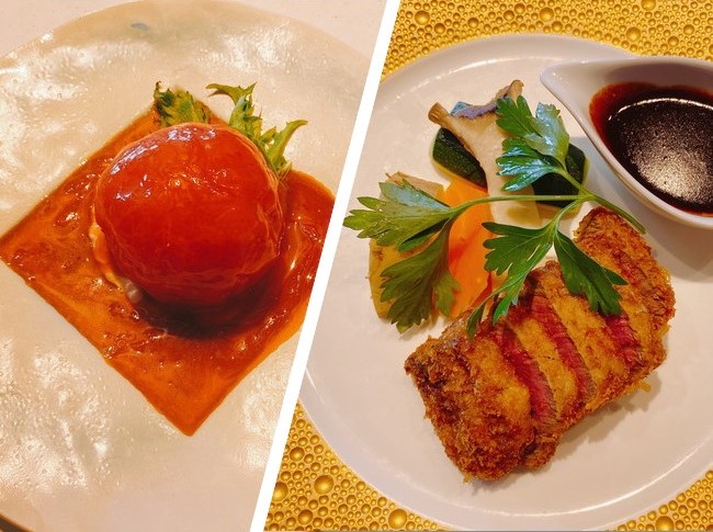 こちらが有馬グランドホテル館内レストラン『ダイニング 時分時』の洋食ランチコース・国産ビフカツ、トマトの丸ごとサラダになります。