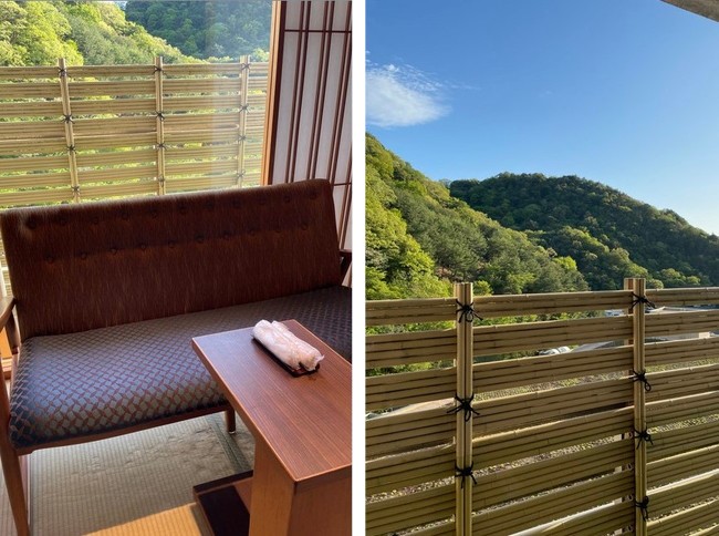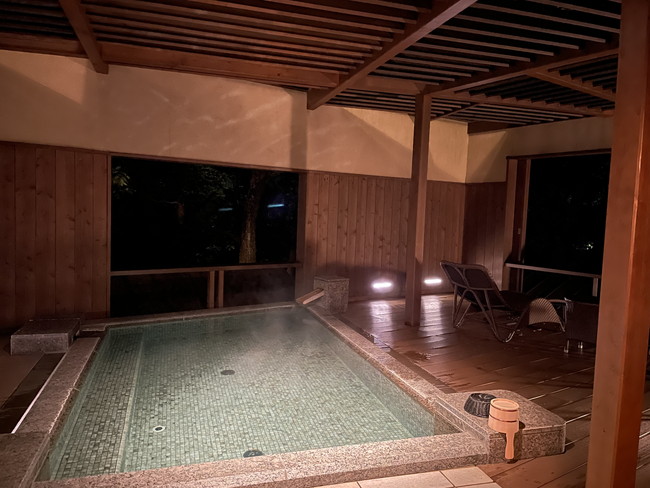 朱音は銀泉となっています(要予約)。屋根は上だけ、外の景色が見える半露天風呂のような造りになっていました。半分お外ということで気温やお天気に左右されそうですが、春だったこともあり、かなり広くて快適でした。
