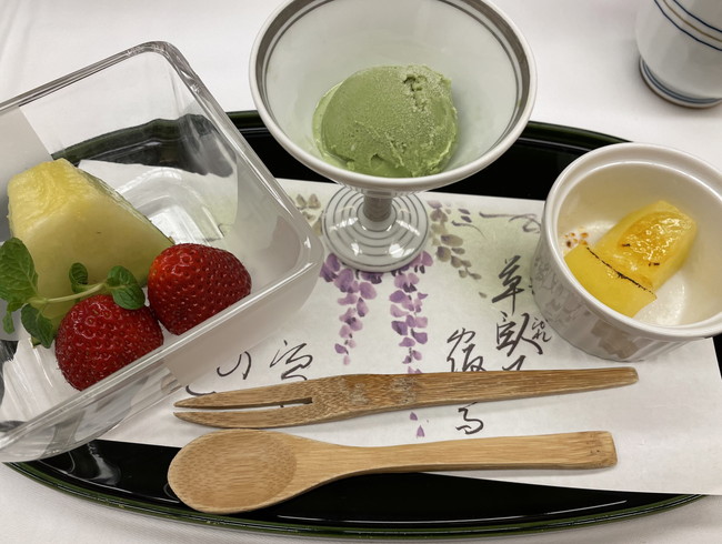 鯛めしはお代わり自由、いろいろなお料理を食べることができて、締めは果物やアイスなどデザート3種。おなか一杯になりました。また、お部屋食ではなく食事用のお部屋での夕食でしたが、他の人の音などもせず、静かにゆっくりと食事をすることができてとてもよかったです。