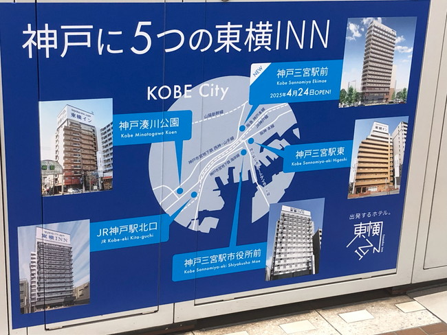 神戸市内にある東横インは、『神戸三宮駅前』『三宮駅市役所前』『神戸三宮駅東』 『JR神戸駅北口』『神戸湊川公園』の5つです。ちなみに『神戸三宮駅前』は、2025年4月に開業したばかりで5つの中では一番新しいホテルです。