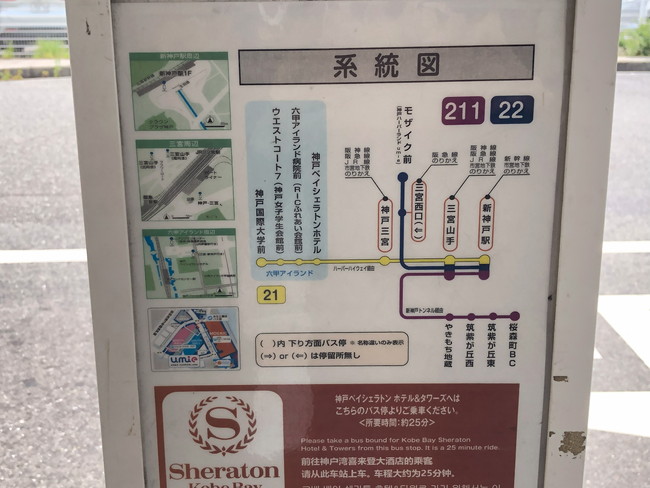 六甲アイランドのホテルには無料送迎サービスはありませんが、神戸空港、三宮駅、新神戸駅など主要な乗り換え拠点から有料で直行バスが出ています。重い荷物を持っている前日入りの際は、乗り換えの多い六甲ライナーよりも直行バスの利用が便利だと思います。本数が限られているので、事前にバス停の場所や時刻表を確認しておきましょう。詳細は下記をご覧ください。