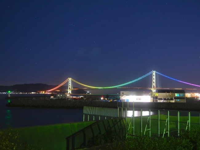 夜には、ライトアップされた明石海峡大橋が、海の向こうにくっきりと浮かび上がります。橋のバックには淡路島のシルエットも見えて、とても幻想的ですね。ベンチに座って、ゆったりと夜景を眺められるのもおすすめのポイントです。時間帯や季節によって橋のイルミネーションが変わるので、何度行っても新しい景色を見ることができます。