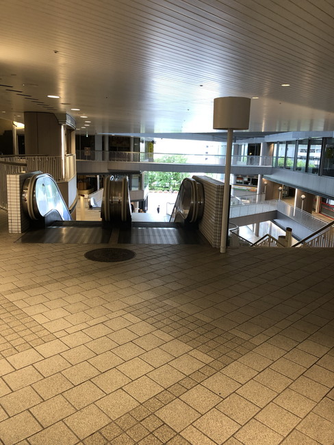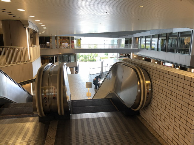 階段の左隣には、エスカレーターもあります。エスカレーターの横に見えるガラスの建物は、残念ながらエレベーターではありません。
