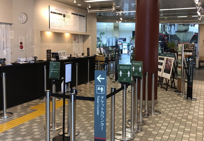 4階に到着しました。チケット売り場です。奥にロープウェイの乗車場所も見えますね。私たちは、ベビーカーをたたんで乗車していましたが、たたむのが難しい車椅子などはそのまま乗車できることもあるそうです。詳しくはスタッフさんの指示に従ってくださいね。