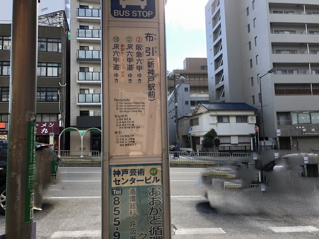 こちらが、三宮方面から阪急六甲方面に向かう市バスです。布引停留所で下車します。
