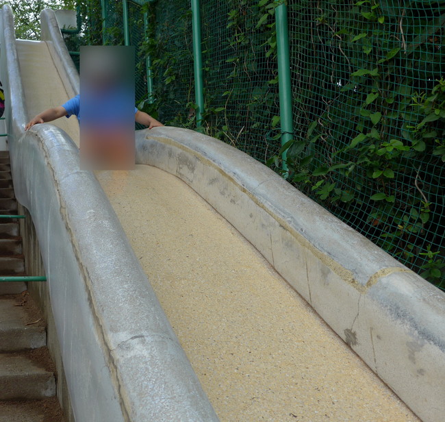 園内の南側に大きな滑り台があり、いつも子供たちで賑わっています。休日は順番待ち必須です。この滑り台は、象をイメージして作られていて、階段の両側に2レーンがあります。